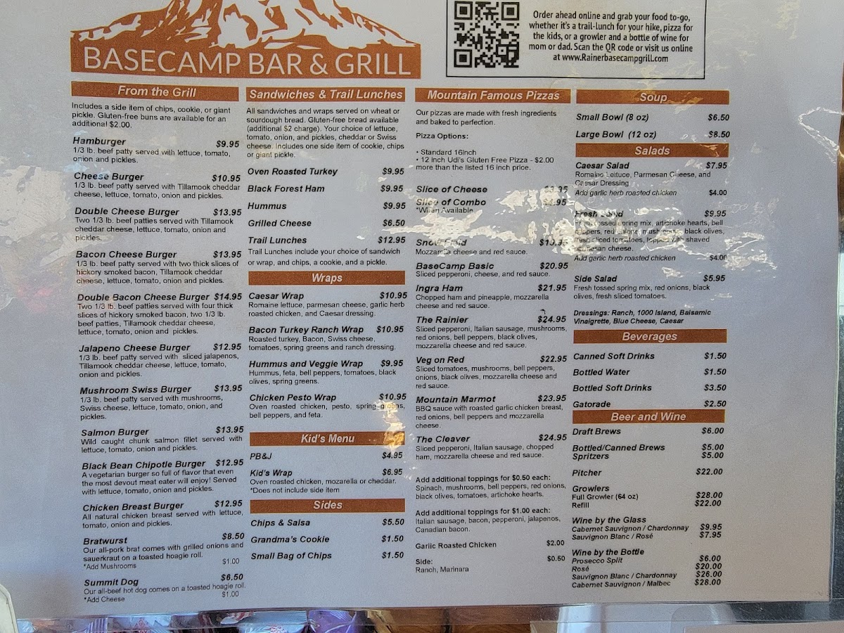 Whether you’re dining indoors or enjoying the outdoor seating with a fire pit and stunning mountain views, the Rainier BaseCamp Bar & Grill provides a unique culinary experience. With expertly crafted dishes and a welcoming spirit, this spot is not just a place to eat—it’s a destination that you’ll want to return to again and again. Grab your friends or family, and enjoy everything this grill has to offer, because every visit promises new flavors and memorable moments.